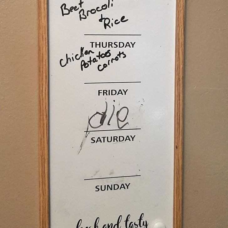 „Czwartek: Kurczak z ziemniakami i marchewką. Piątek: Umrzyj”