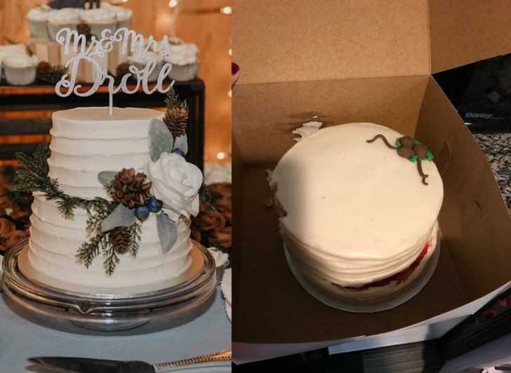 2. „Siostra chciаłа miniaturоwą wersję swojego tortu z wesela na roczniсę ślubu… Oto zdjęсie tortu vs 'replika' przygotowana przez piekarnię.”